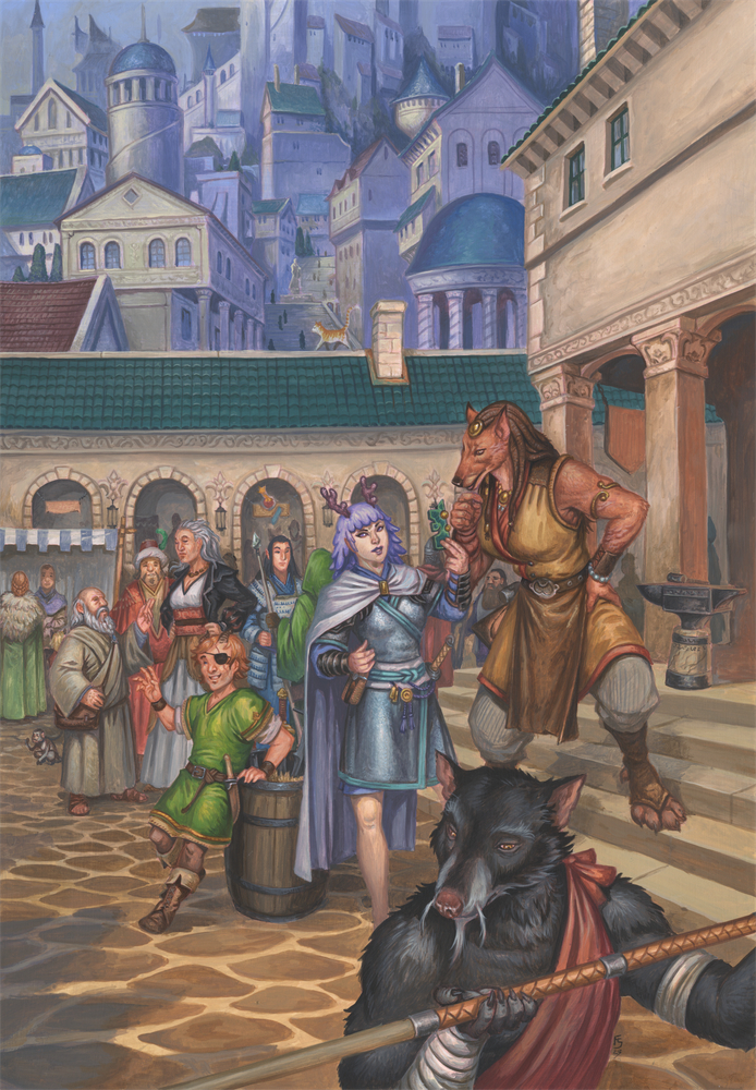 Beim Cover haben wir uns ganz bewusst dafür entschieden, dass es die Parallelität zu Feinde & Schurken widerspiegelt. Florian Stitz hat daher auch hier eine Auswahl von im Band enthaltenen Persönlichkeiten auf dem Cover in einer kleinen Szene in Ioria zusammengeführt.